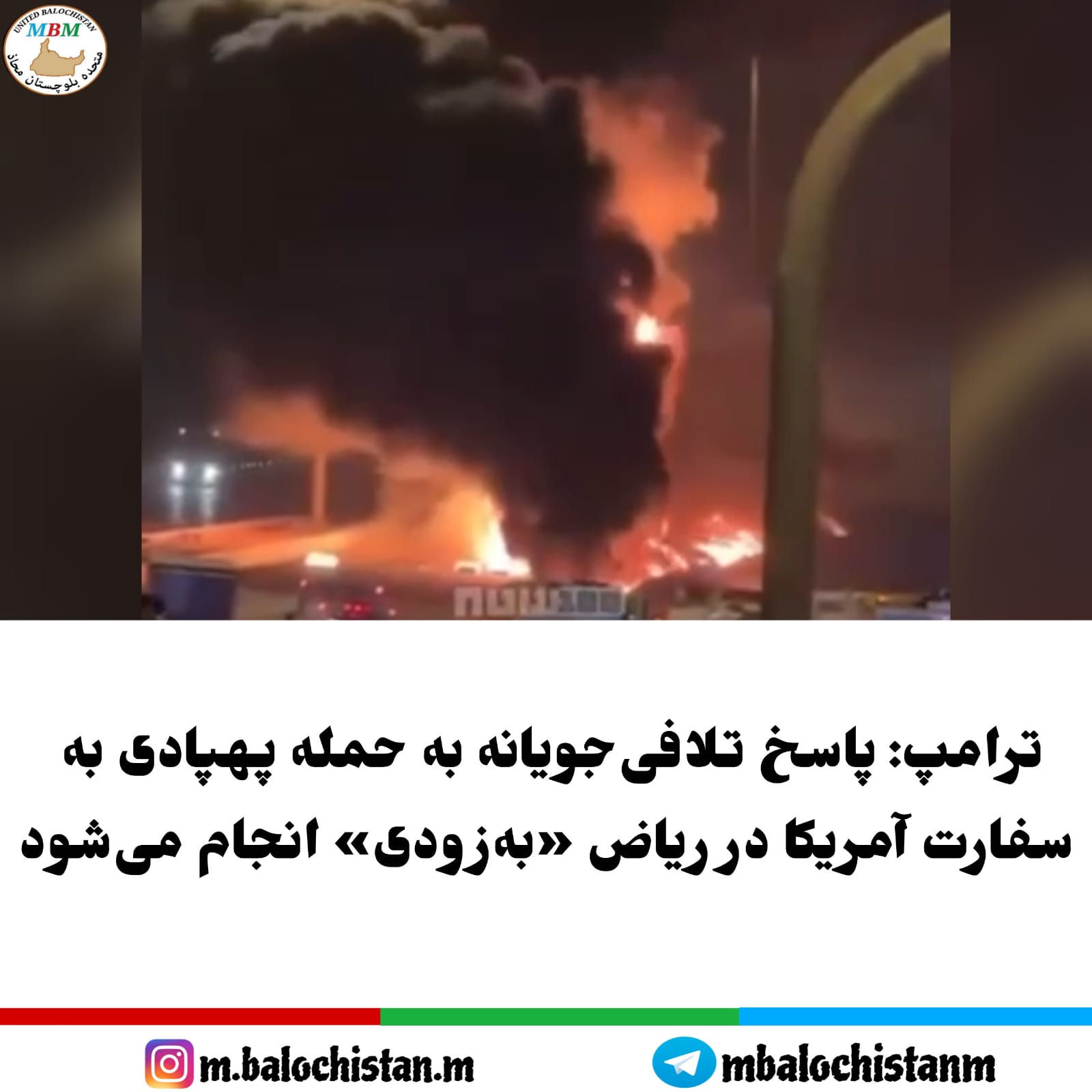 متحده بلوچستان محاذ|امروز سهشنبه ۱۲ اسفند ماه ۱۴۰۴، دونالد ترامپ، رئیس جمهور آمریکا، در واکنش به حمله پهپادی به سفارت کشورش در ریاض گفته است که ايالات متحده ممکن است «به زودی» به این حمله و کشته شدن نيروهای نظامی آمريکايی پاسخ تلافیجویانه دهد.